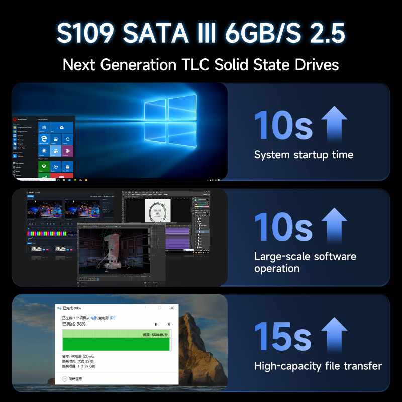 S109 uses a new main control, with TLC particles, and the ultimate performance combination optimizes the speed. Its reading speed is as high as 550 MB/s, helping you enjoy high-efficiency work.