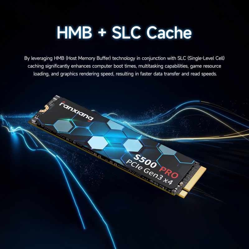With HMB memory buffer technology and SLC Cache intelligent cache, a FTL (flash translation layer) is built with the high-speed read and write of the host's memory (Memorv), so that the SSD can play an excellent read and write performance. Significantly improve the speed of computer startup, multitasking, game resources and graphics loading and other transmission and reading