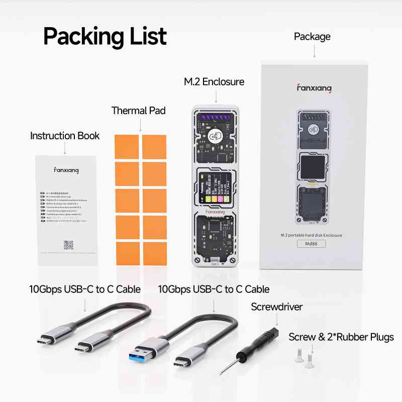 The Fanxiang M.2 mobile solid-state hard disk enclosure supports M2 PCle NVMe SSD 2230/2242/2260/2280 specifications and supports M key interface/B+M key interface with a maximum capacity of 4TB